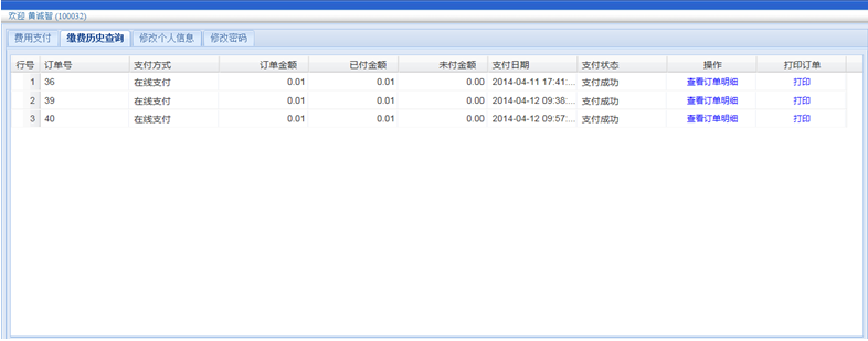 在上图中点击 “打印订单” 进入图2-8订单信息。在图2-8中根据相关提示打印发票,完成缴费操作。这样我们就完成了一次缴费操作。此时“缴费历史查询”会产生一条本次缴费的相关记录(注:缴费历史查询的使用参考:2.2. 缴费历史查询)。